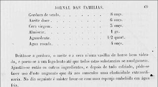 Observam-se também, durante a leitura do jornal, receitas de produtos cosméticos caseiros para cuidar da pele, dos cabelos, receitas para cozinhar, instruções para bordar, fazer crochê ou indumentárias da época. Como exemplos, segue abaixo a figura 01 e 02 mostrando uma receita caseira para cuidar da pela e explicações sobre figurinos.